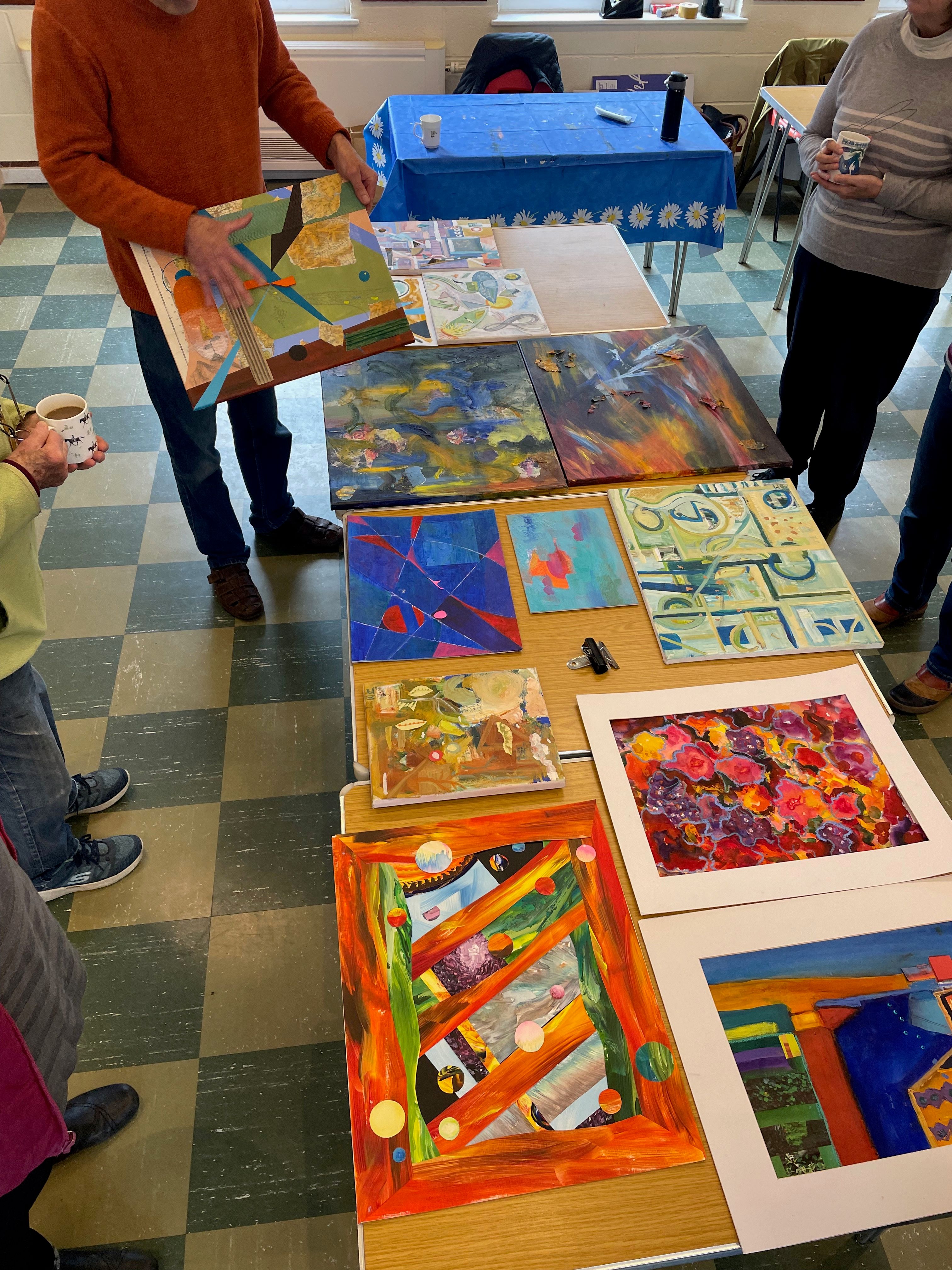 He went on, in November, inviting us to turn the 2D into 3D sculpture (of cardboard) representing facets, and heart, of the 2D montage. We got only so far as you can see below, and in the coming month will continue the work. We have not had such fun since school days!